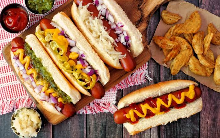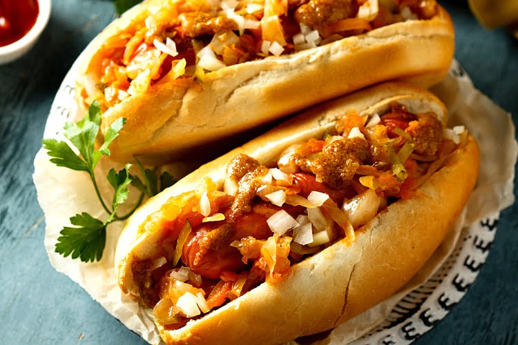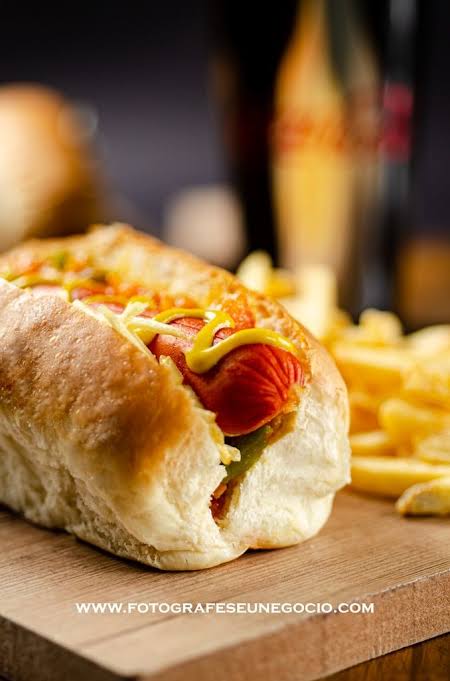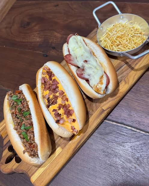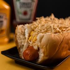 Um delicioso pão de dog com duas salsicha Perdigão saborosíssima, ketchup e mostarda Heinz de altíssima qualidade e um toque de maionese com purê de batata com linguiça redondinha Perdigão coberto por batata palha crocante de altíssima qualidade.