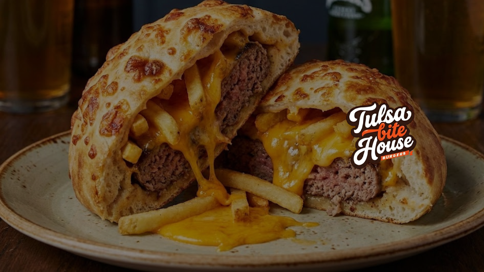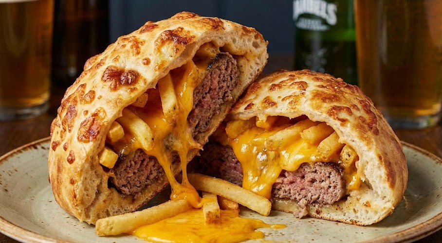 Um delicioso lanche com hamburguer, cheddar e batata frita, enrolado numa massa especial